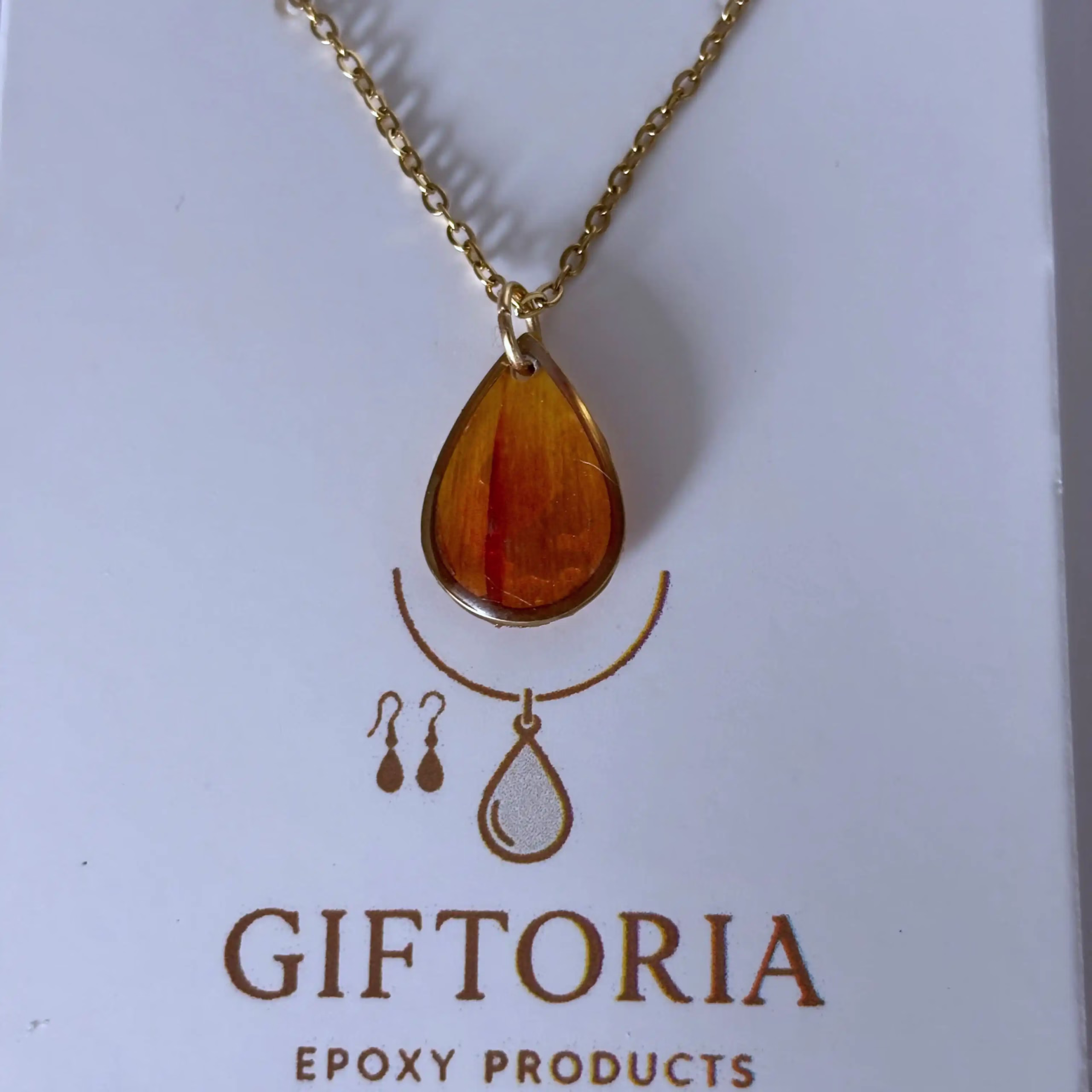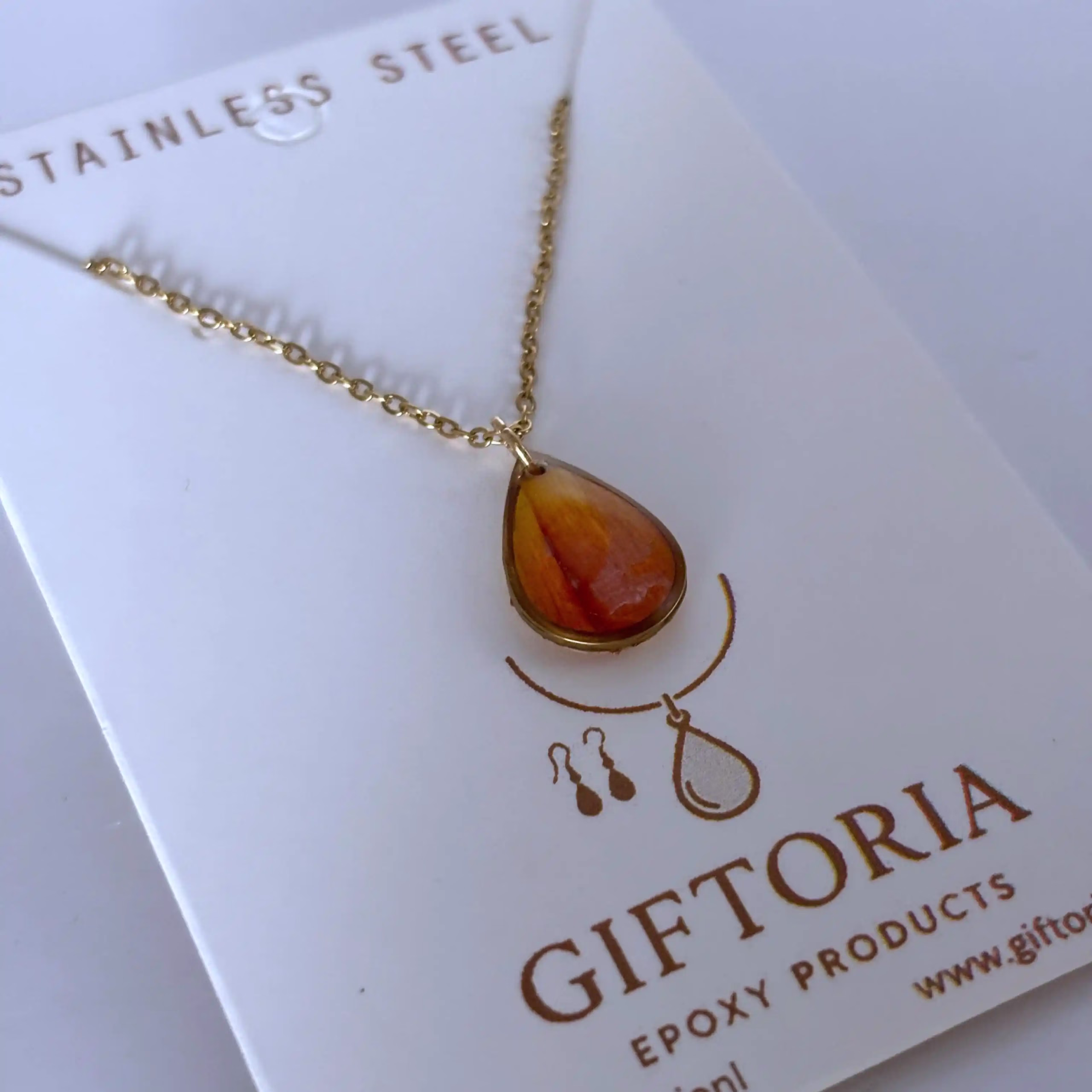 Transparante epoxy hars met oranje pigment, roestvrij staal gouden ketting. 100% handgemaakt en personaliseerbaar in Nederland door Giftoria.