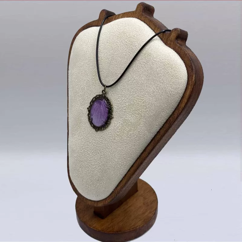 Deze vintage ketting met geperste bloem is een prachtig, handgemaakt sieraad dat een vleugje nostalgie en natuurlijke schoonheid combineert. De hanger heeft een ovale vorm en een sierlijke, bronskleurige omlijsting in authentieke Victoriaanse stijl. Binnenin is een echt, zorgvuldig geselecteerd paars bloemblad geconserveerd in kristalheldere, hoogwaardige kunsthars, waardoor elk detail van het blad zichtbaar blijft. Door het gebruik van echte bloembladeren is elke ketting uniek.